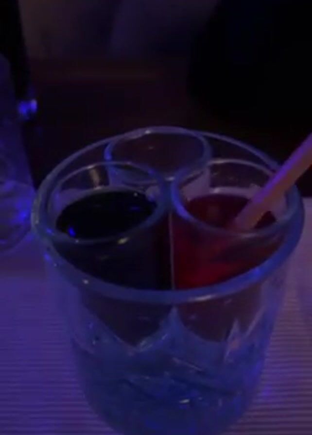 A cocktail with three different-colored liquids held in separate compartments is illuminated with a blue light. The three liquids are black, clear, and red. A tan-colored straw rests in the red-colored liquid. The container holding the liquids is made of patterned glass. Someone reaches toward the container and puts the straw in the black-colored liquid. An empty glass sits to the left of the container on a white-striped surface. A dark area appears in the background behind the container.