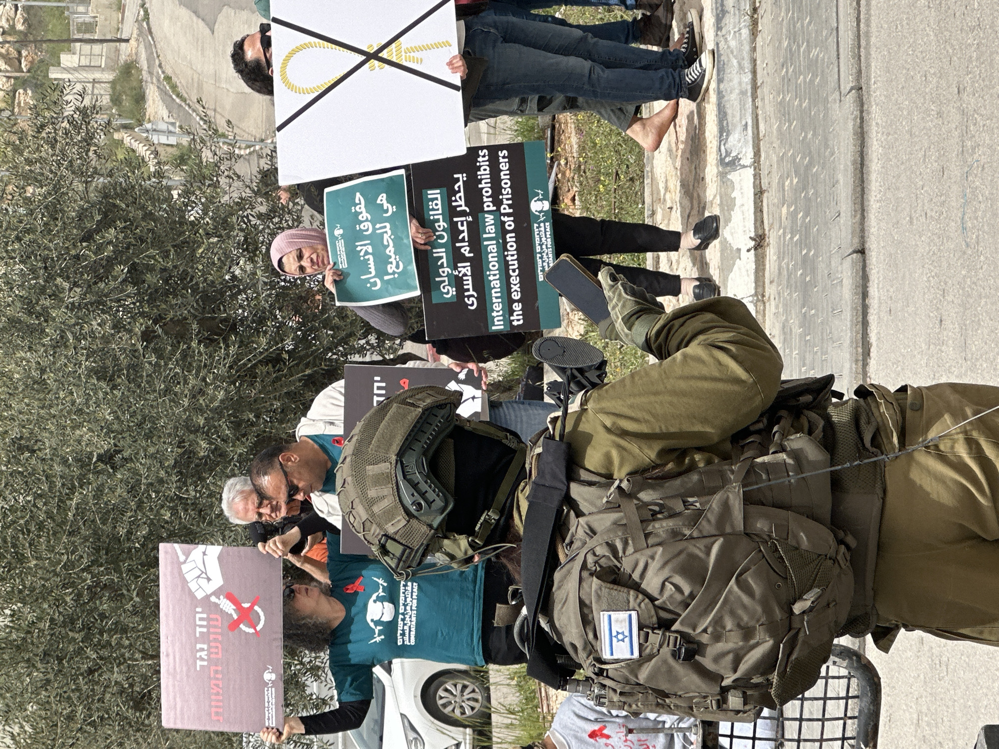 A daytime outdoor scene in a-Doha, Palestinian Territory, shows an Israeli soldier standing in front of a group of people protesting. The soldier, wearing a military helmet, a green uniform, and a large backpack with an Israeli flag patch, faces the protesters. The protesters are holding signs in both Arabic and English that advocate for human rights and protest the execution of prisoners. Some of the signs depict a noose with a line through it, symbolizing opposition to capital punishment. The environment includes trees and a sidewalk, suggesting the protest is taking place in an urban area. The setting appears to be along a street, indicated by the presence of a paved road and a parked white car in the background.