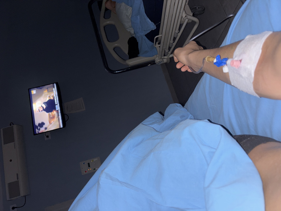 The image depicts a dimly lit hospital room in Sofia, Bulgaria, viewed from the perspective of a patient in bed