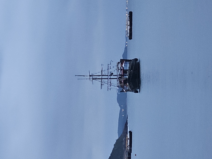 The image displays a maritime scene within a bay in Armação dos Búzios, Brazil, during twilight conditions. A dark-hulled, multi-masted vessel, configured as a tour boat, is centrally positioned in calm, dark blue water. The vessel exhibits multiple operational lights on its deck and rigging. To the left of the vessel, closer to a dark, undulating landmass, a dark floating platform is visible, accompanied by a single red buoy. To the right, further in the distance, another dark floating platform, illuminated by several small lights, is present. The sky is uniformly overcast, presenting a dark blue-grey tone. Distant landmasses, characterized by hills, delineate the horizon, with sparse artificial lights visible on the far right shore. No individuals or specific human activities are discernibly visible on the vessel or in the water.