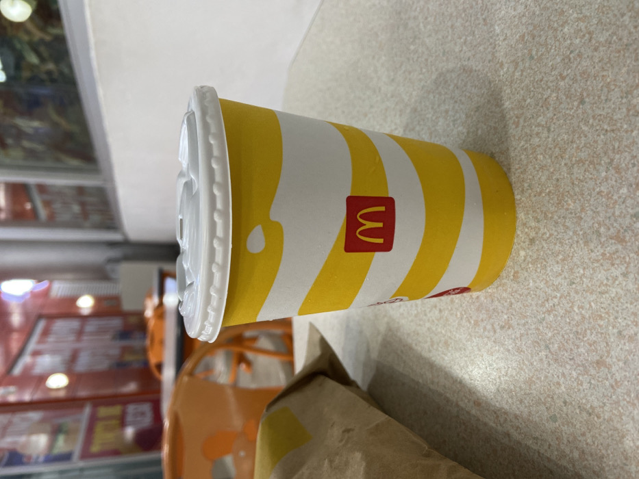 A McDonald's drink cup with a white lid sits on a speckled surface. The cup features yellow and white stripes and the iconic golden arches logo. A brown paper bag is partially visible beneath the cup. In the blurred background, orange chairs and a menu board are seen within the restaurant setting.
