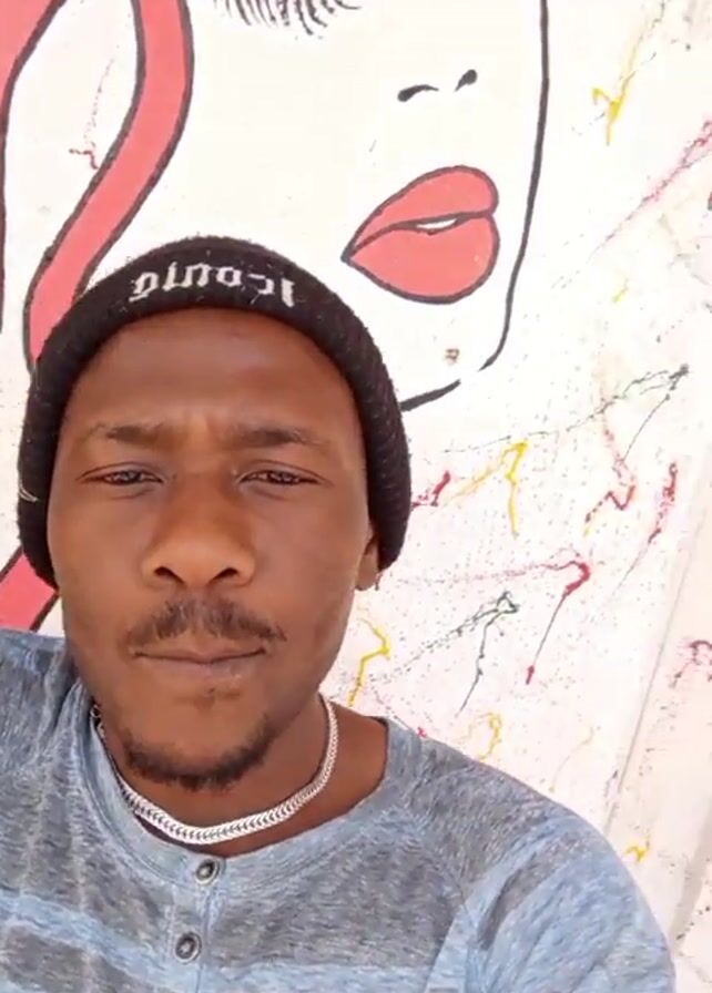 A man with dark skin, a thin mustache, and a black beanie with the word "ICONIC" written on it, looks at the camera. He wears a gray and blue striped Henley shirt and a silver chain necklace. He is situated in front of a wall with a large cartoon-style drawing of a woman's face, with red lips and eyelashes, and red hair. The wall also features colorful splatters and lines. The camera angle is from slightly above the man, looking down at him. The background seems to be an outdoor setting with partially visible structures, likely a building or a canopy overhead. He appears to be making a face, squinting slightly.
