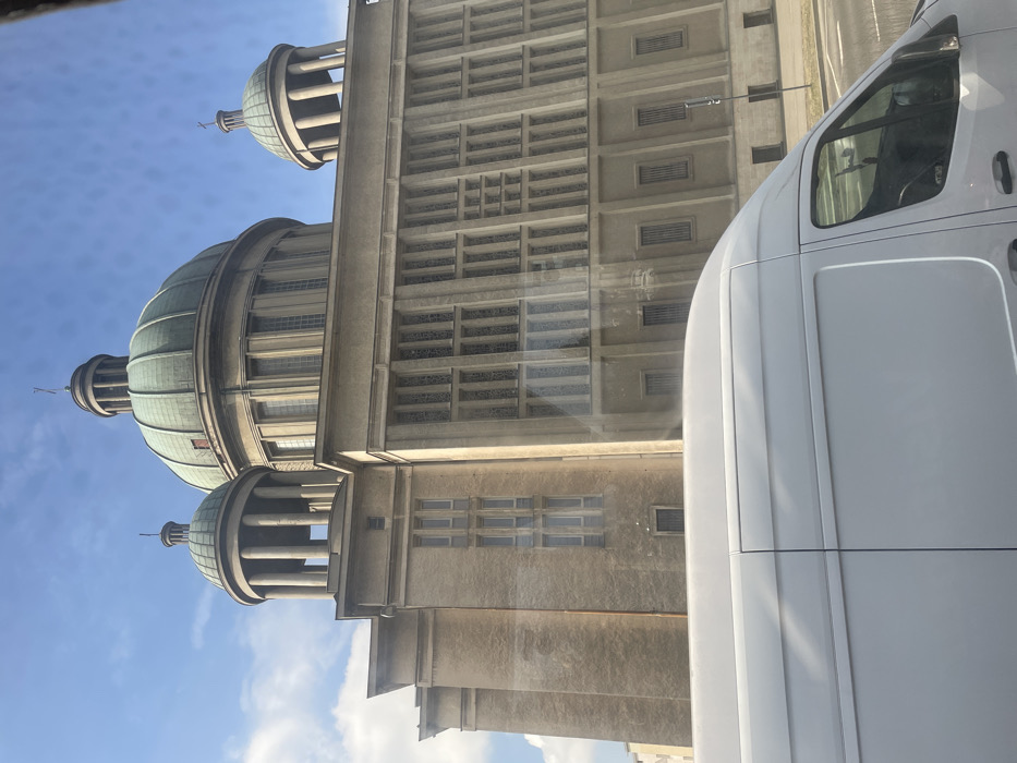 The image displays the Church of the Holy Spirit (Kościół Świętego Ducha) in Łódź, Poland, viewed from a street-level perspective, partially obscured by a vehicle. The building, a substantial beige concrete structure, occupies the upper two-thirds of the frame, under a mostly clear blue sky with minimal white clouds. Its prominent features include a large central dome flanked by two smaller domes, all exhibiting a distinct green patina, indicative of weathered copper or bronze, and each topped with a cross. The church facade presents a grid-like arrangement of numerous tall, narrow, rectangular windows set into recessed panels. The lower third of the image is dominated by the upper body and roofline of a white panel van, possibly a delivery vehicle, positioned in the immediate foreground. Reflections on the van's passenger side windows and the glass surface through which the photograph was taken indicate observation from within another vehicle. No individuals or specific actions are discernible. The church is situated at the intersection of ul. Piotrkowska and al. Kościuszki in Łódź.