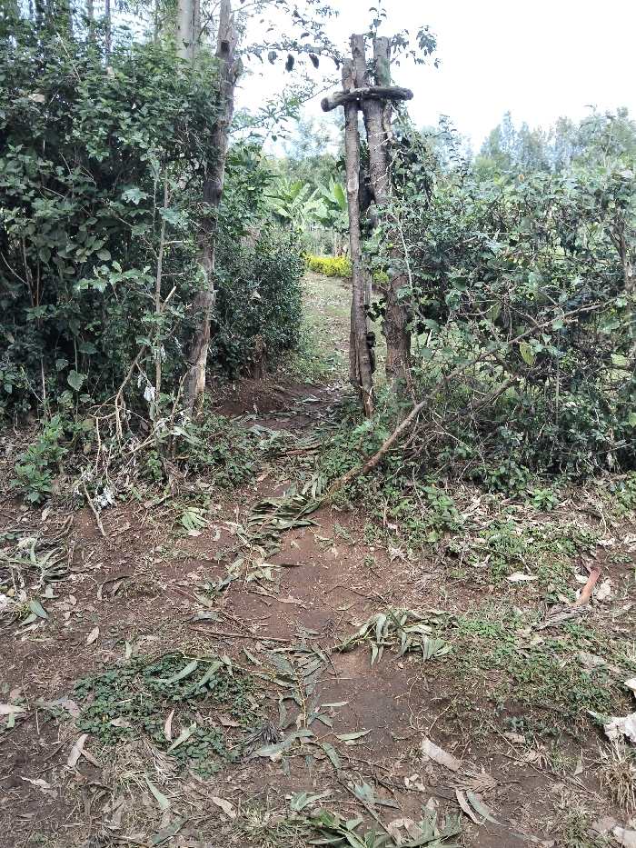 The image displays a dirt path traversing a densely vegetated outdoor environment in Nyansiongo ward, Kenya