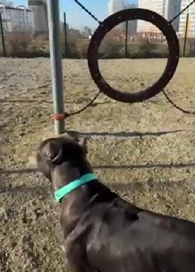 medium-sized, dark brindle dog at a dog park. The dog has a white spot on its chest and a light green collar. It approaches a circular dog agility obstacle made of a metal ring suspended between two poles. The ground of the dog park is covered in small brown pebbles. In the background, tall apartment buildings are visible under a clear blue sky. The dog sniffs the orange connector on one of the poles, then looks directly at the camera.