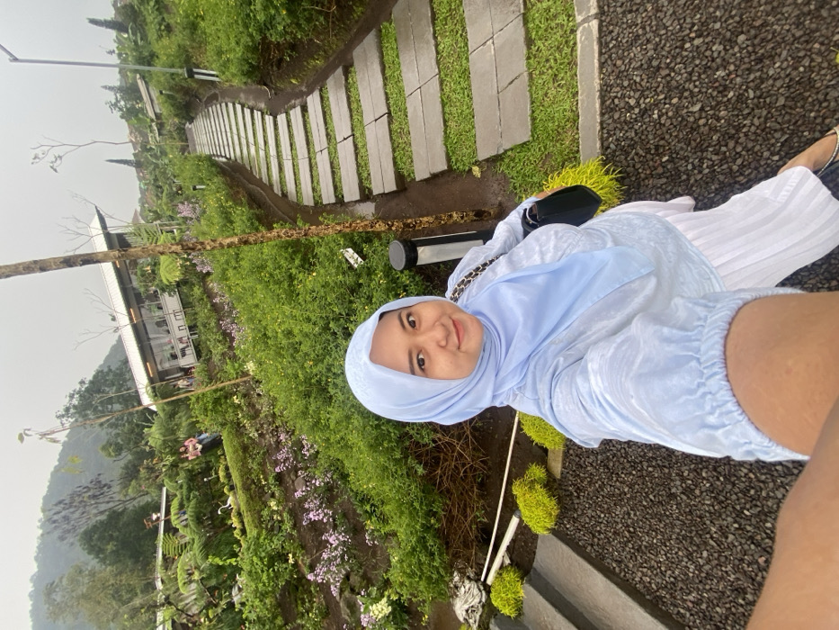 An image displays a female individual posing for a selfie in an outdoor garden setting in Trawas, Indonesia, under an overcast sky