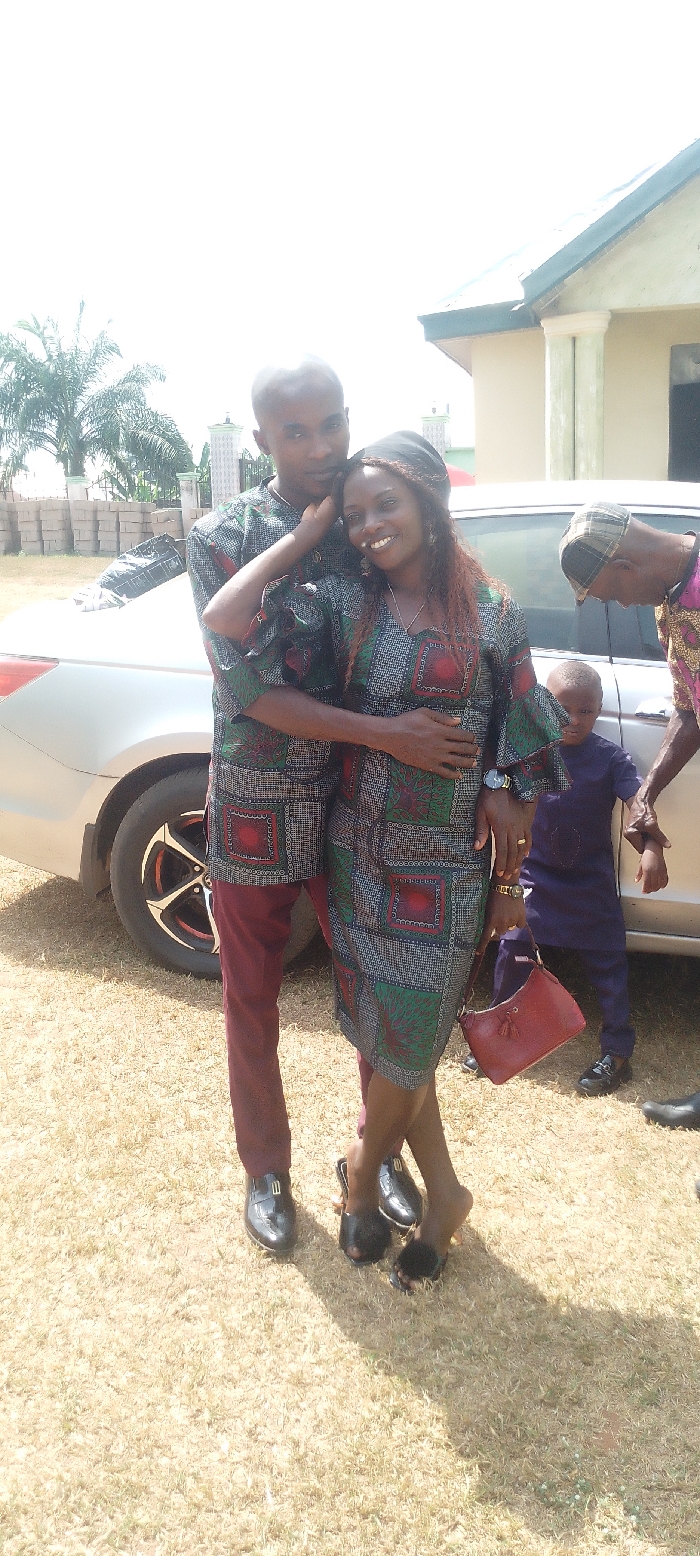 A smiling couple in matching patterned outfits stands outdoors. The man wears trousers, while the woman wears a dress and carries a purse. They are embracing in front of a silver car. In the background, there's a young child in a blue outfit and an older person wearing a patterned shirt. Stacks of bricks and a building can also be seen. The ground is covered in dry grass.