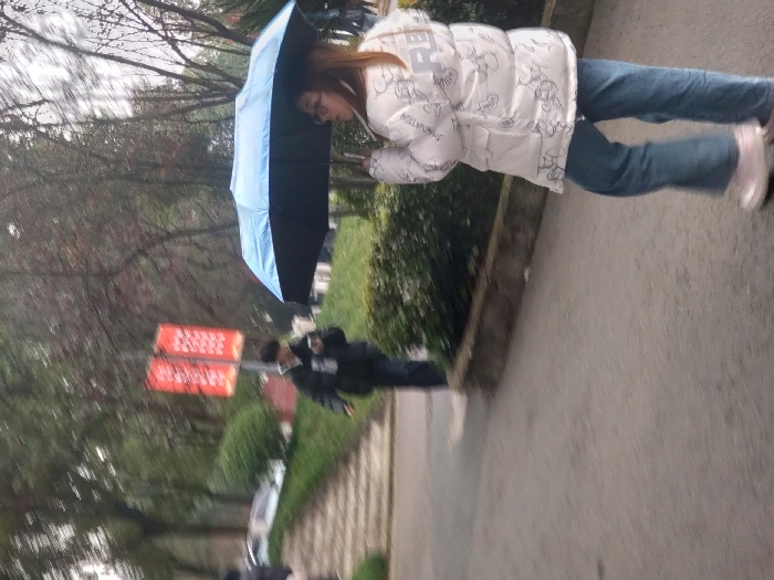 A woman with an umbrella is walking along a path next to a grassy area. She is wearing a white patterned jacket, blue jeans, and pink shoes. A man is walking in the opposite direction near a red sign and trees. The path appears to be paved and has a concrete edge on one side. The weather is overcast.