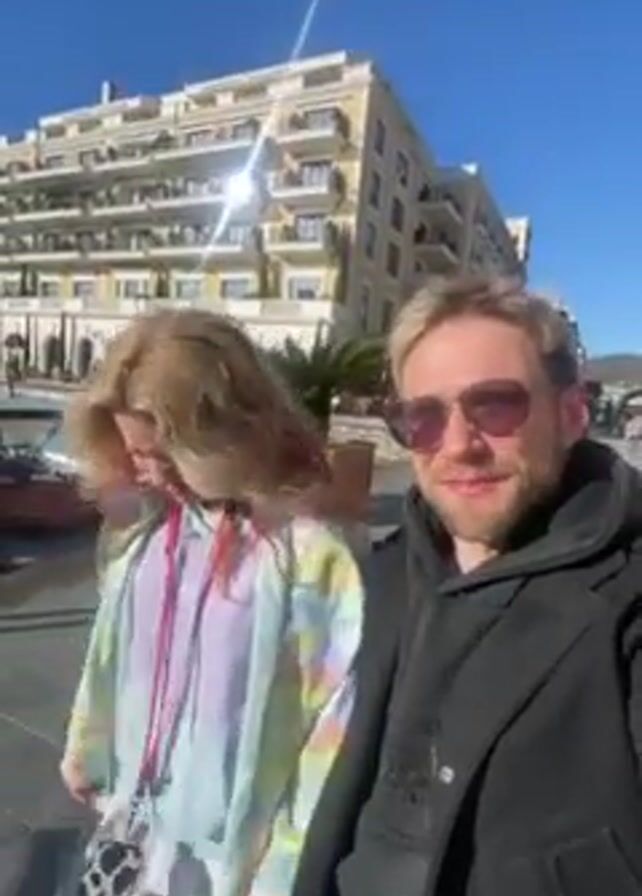 Two people are filming themselves with a handheld camera. The camera is mostly focused on the man's face, and he is smiling at the camera while wearing sunglasses and a black coat. Next to him is a woman with blonde hair that has some pink streaks. She is wearing a light-colored tie-dye jacket. They are walking on a sunny day, and behind them is a large, multi-story building. The sky is blue.