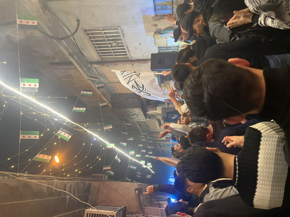 - "A group of people gathered under an awning or ceiling decorated with Syrian flags and string lights" by FM-JY1rf2, licensed under CC BY 4.0