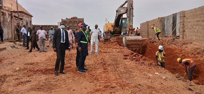 The scene depicts an active outdoor construction site in Rigasa, Nigeria. The ground consists of reddish-brown dirt and mud, marked by tire tracks. A deep, rectangular trench runs from the center-right towards the background. On the left side of the frame, a group of approximately ten to twelve adult males is present. In the immediate foreground, a male individual stands facing the viewer, wearing a dark suit, white shirt, dark tie, dark shoes, and a light blue surgical face mask. Behind him, another male wears a dark tunic, dark trousers, and a bright green reflective vest, with a dark cap. Other individuals in this group wear various attire, including suits, collared shirts, and traditional white garments. Several members of this group appear to be observing the ongoing work. In the mid-ground, a large yellow excavator with a "CAT" logo is positioned behind the trench, its bucket extended into the excavated earth. Further back on the left, a large brown dump truck is partially visible. To the right, three construction workers are engaged in activity around the trench. One worker, wearing a yellow high-visibility vest and an orange hard hat, stands on the excavated dirt pile. Another worker, in a yellow high-visibility vest and a white hard hat, is positioned inside the trench. A third worker, wearing an orange high-visibility vest and a yellow hard hat, is actively digging with a shovel inside the trench on the far right. The background features various structures. On the left, a building with peeling reddish-brown paint and a visible power pole is present. On the right, a wall constructed from concrete blocks and sections of corrugated metal sheeting forms a barrier. The sky is overcast.