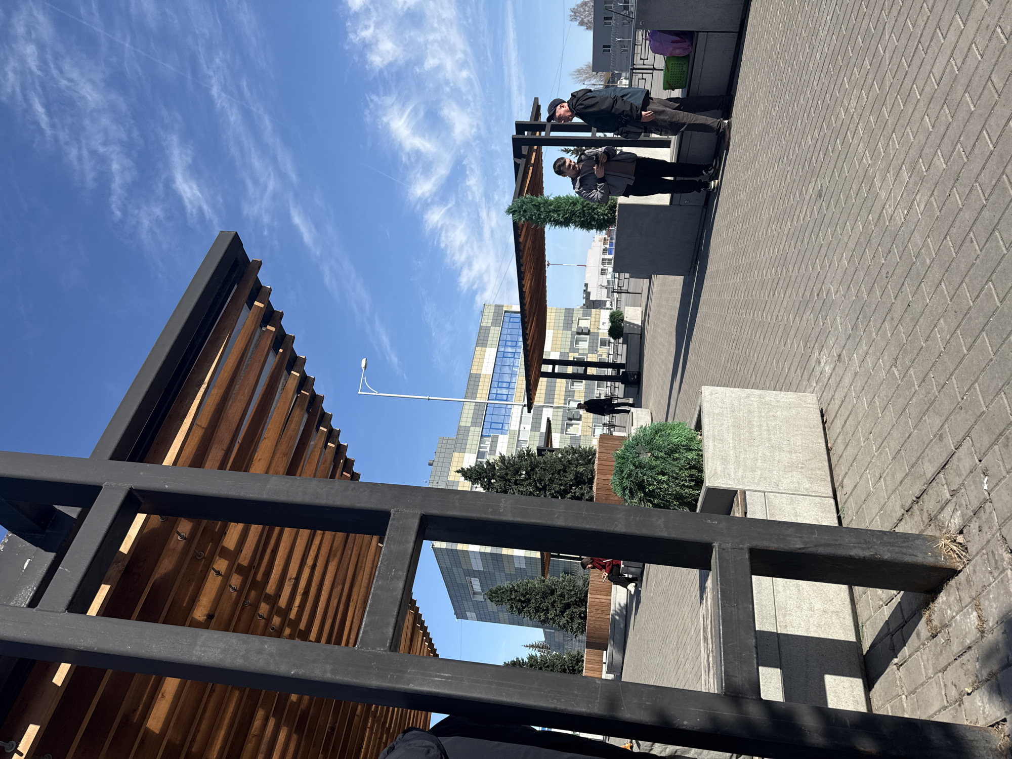 On a clear day in Ufa, Russia, a horizontal medium shot depicts a paved public area with modern architectural elements. Two individuals stand near a shaded structure with a wooden slat roof and black metal frame, adjacent to planter boxes containing shrubbery. Nearby stands a multi-story building with blue-tinted windows. A lamppost rises behind the structure, and the sky is streaked with cirrus clouds. The foreground features a close-up of another black metal structure with wooden slats.