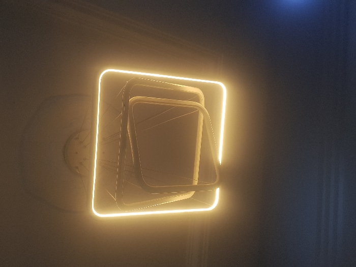 The image displays a modern, multi-tiered ceiling light fixture installed in a room in Lokoja, Nigeria. The fixture consists of three concentric square frames, each progressively smaller and suspended beneath the previous one. The perimeters of these frames are illuminated with a warm amber LED light, creating a glowing effect. Thin suspension wires are visible, attaching the fixture to a light-colored, possibly off-white, ceiling, where a circular mounting canopy is present. The ambient environment is dim, with the lower portion of the image exhibiting a dark blue-gray background that transitions into shadow. A small, distant blue light source is faintly visible in the lower right quadrant of the scene. No individuals, explicit actions, or interactions are depicted.