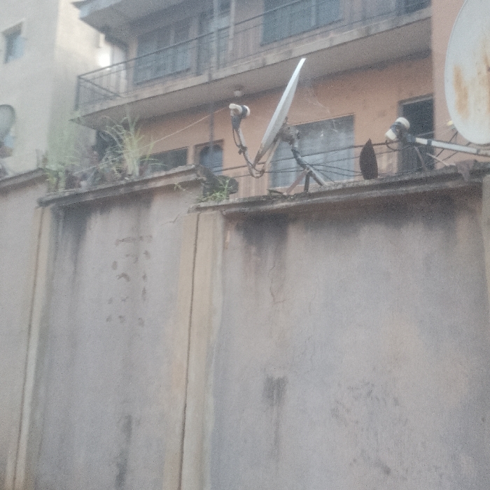 The image displays an urban scene in the city of Unknown, Unknown, primarily depicting a weathered concrete perimeter wall with a building behind it. The wall, occupying the lower two-thirds of the frame, is light gray to beige, showing numerous vertical dark stains and faded, irregular markings. It features a distinct cap along its top edge. Mounted on or directly behind this wall are several satellite dishes; a prominent off-white parabolic dish is centrally positioned, flanked by a partially visible darker dish to its right and another partial dish to its far left. Wild grasses and small plants grow sparsely along the wall's crest and immediately behind it. A dark, roughly conical or cylindrical object rests on the wall cap to the right of the central satellite dish. In the background, a multi-story building, light brown or peach in color, is visible. It features a balcony with a dark metal railing on an upper floor and multiple dark windows. A lighter-colored building section is partially visible on the far left. No individuals, specific actions, or interactions are depicted.