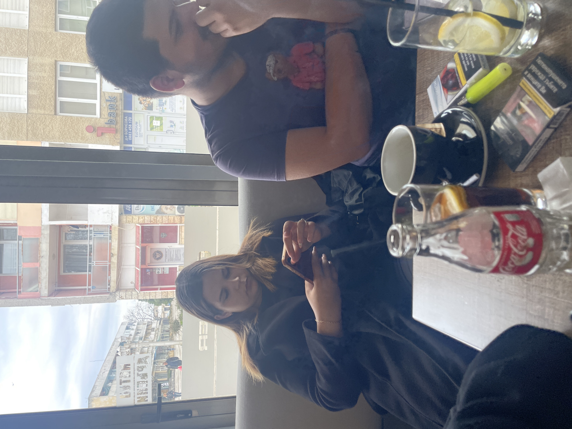 The image depicts two individuals seated at a table, possibly in a café or restaurant. One person, possibly a male, is wearing a dark purple shirt with a teddy bear graphic. A woman wearing a dark coat is seated next to him, focused on her smartphone. On the table, there is a glass of water with lemon slices, a pack of cigarettes, a lighter, a coffee cup on a saucer, and an empty glass Coca-Cola bottle. Through the window, the street scene includes buildings with various signs, including a bank and a pharmacy, possibly identified as "Д-Р БОРИСОВА" (Dr. Borisova) with a phone number and the word "bank" in Cyrillic. This places the scene in the city of Kavarna, Bulgaria.