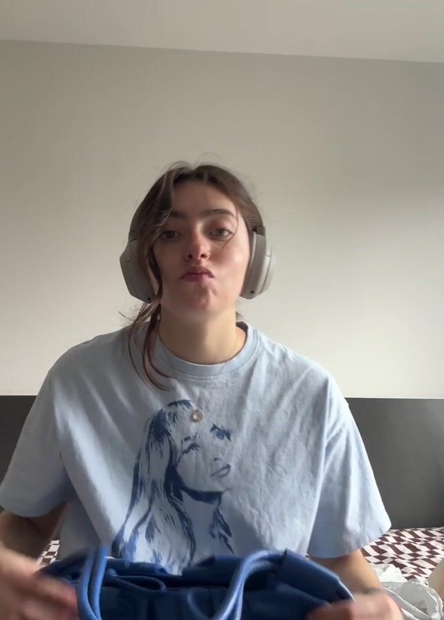 A young woman sits cross-legged on a bed in front of a white wall. She is wearing a light blue t-shirt with a drawing on it, dark pants, and gray headphones. She holds up a blue, gathered leather bag, turning it to show its shape. She then displays a white tag attached to the bag, bringing it close to the camera to show the text printed on it. The bed has a brown and white patterned blanket.