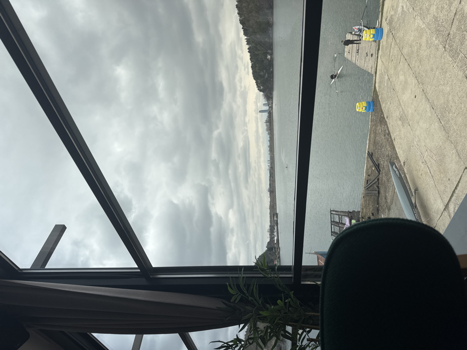 The image captures an outdoor scene at Pancharevo Lake in Pancharevo, Bulgaria, viewed through large windows from an interior space. The immediate foreground on the left shows the upper portion of a dark green upholstered chair and a potted green plant, partially obscured by a dark window frame and a brown curtain. The outdoor environment is dominated by the calm, grey surface of Pancharevo Lake, under an overcast sky filled with uniform grey clouds. A concrete shoreline is visible in the lower right and middle ground. On this concrete, a light-colored rowing shell is positioned on a stand. A wooden dock extends from the concrete into the water, and two yellow and blue cylindrical buoys, decorated with 'Minion' character faces, are placed on the concrete near the dock. On the lake, a single individual is present in a white single scull, actively rowing away from the viewer. Two additional individuals are standing on the wooden dock, with one positioned near a second light-colored boat, possibly another scull, moored at the dock. The far side of the lake features a densely wooded hillside, and several distant, taller urban buildings are discernible on the horizon beneath the cloud line.