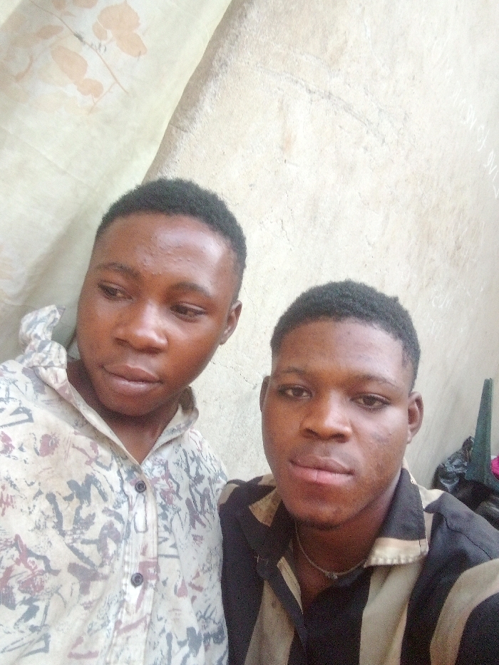 The image displays two young adult males in Akwanga, Nigeria, posing for a photograph
