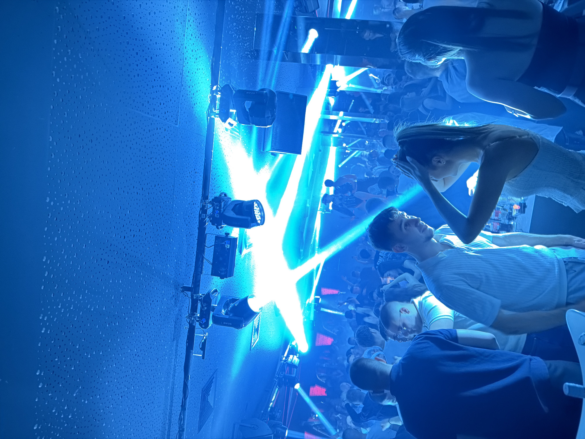 crowded nightclub scene in Sofia, Bulgaria. The interior is bathed in blue lighting, with stage lights projecting beams across the room. Several people are visible, including a woman touching her hair, a man in a white shirt looking up, and another man in a blue shirt facing forward. The room is packed with patrons. Speakers and lighting equipment are mounted on the walls.
