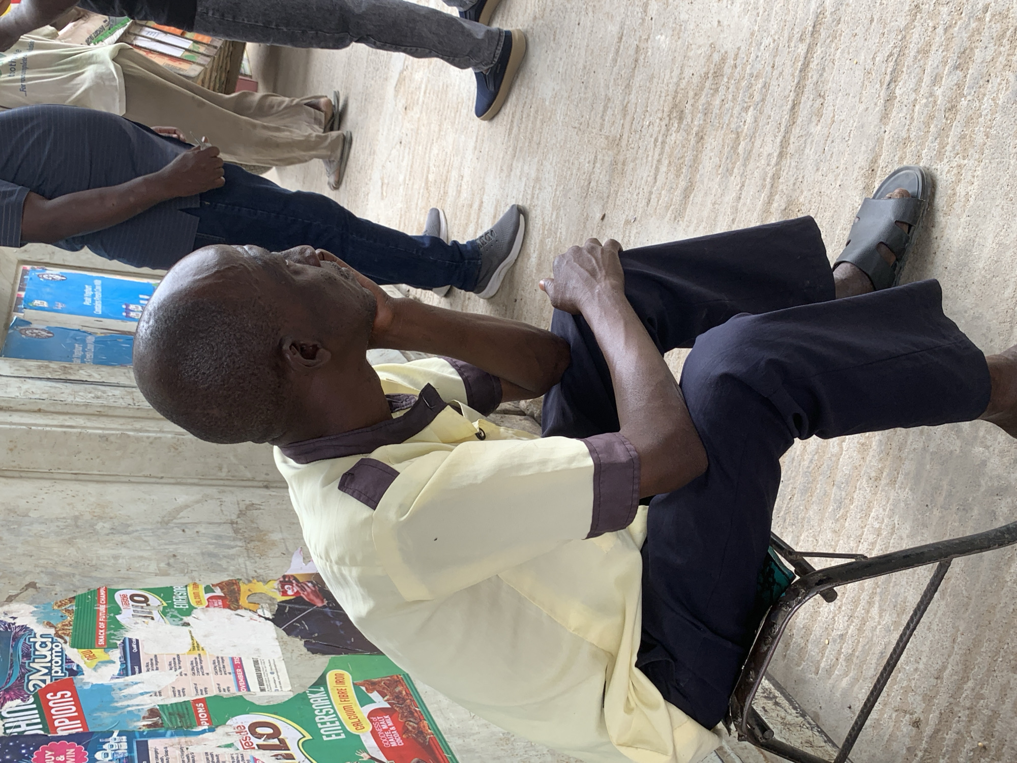 n older Black man sitting in a metal chair in what appears to be an urban setting in Fagge C, Nigeria