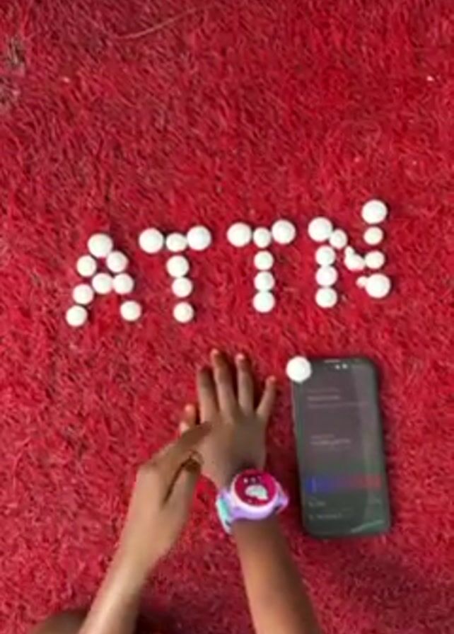 A child sits on a red carpet with the word "ATTN" spelled out in white balls in front of them. The child wears a purple and pink watch on their left wrist and holds a black smartphone in their right hand. The screen of the smartphone is lit up and displays text and a graph. The child taps the watch with their right index finger, and the watch beeps. The watch screen is dark. The video is shot from directly overhead.