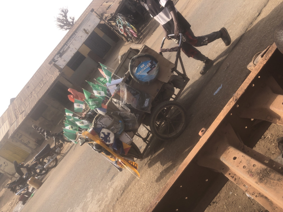 In Kufena, Nigeria, a daylight scene on a dusty street features a three-wheeled cart, heavily laden with merchandise, being propelled by a male individual. The cart is adorned with numerous small Nigerian flags, characterized by their green and white vertical stripes, along with other banners, including one yellow banner with black markings and a red flag. Visible cargo includes packaged items, some marked "4x4", and a circular object labeled "MASSAGER MANAGER". The male, clad in a black and white striped shirt, dark pants with a white design near the knee, and dark shoes, grips the cart's handles, indicating forward motion. In the background, two motorcycles are parked to the left of the road, beside a yellow jerrycan. A building with a corrugated metal roof stands to the right, bearing a sign that reads "DAYYAB CARPENTRY & SERVICES" and displaying various hanging objects, possibly goods for sale. A bare tree is visible against the bright sky. The immediate foreground is occupied by a large, rusted metal beam with multiple circular perforations, partially obscuring the lower part of the scene.