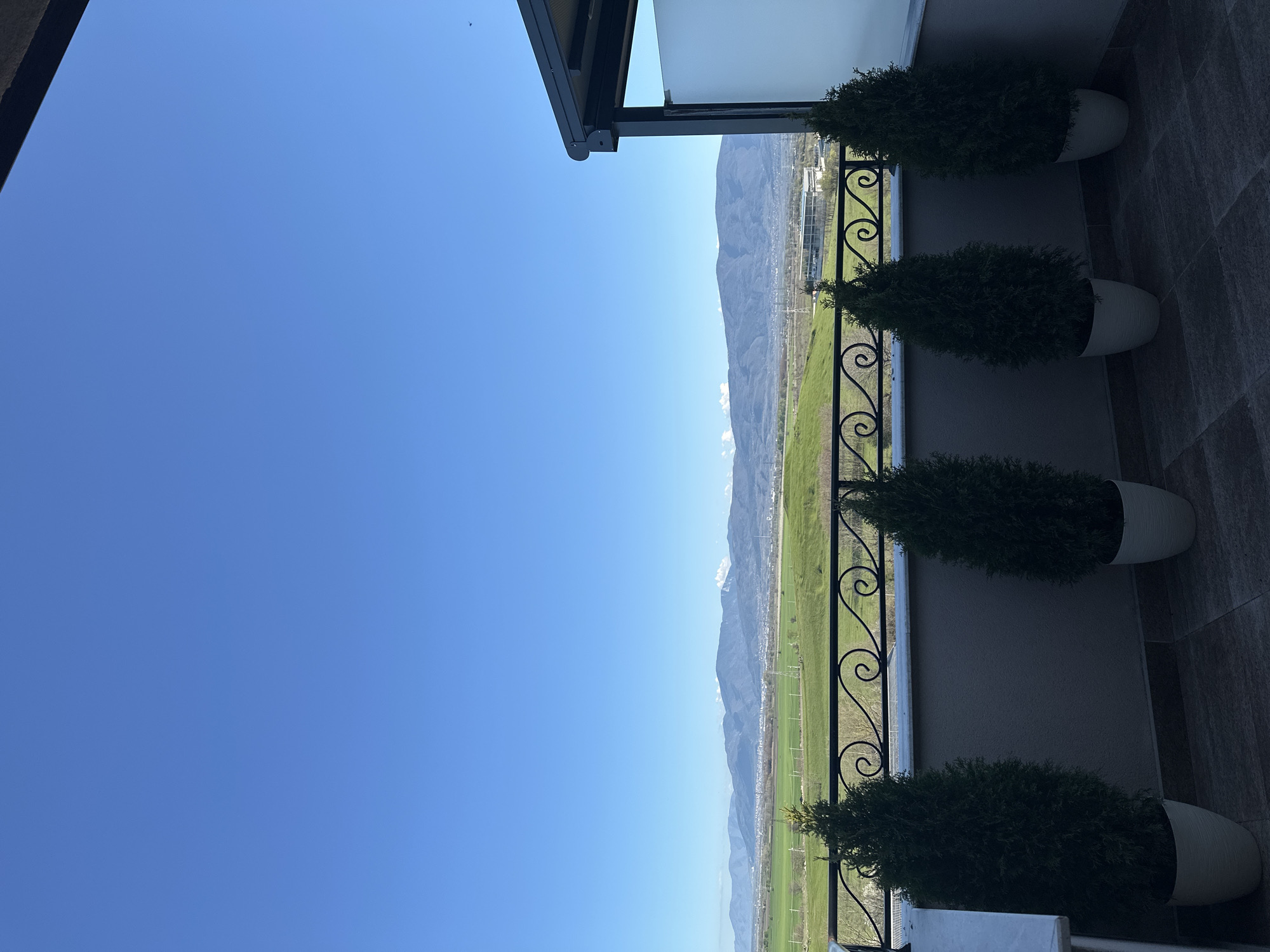 view from a balcony. There's a clear blue sky dominating the left side of the frame. The right side of the image reveals a landscape featuring green fields, a mountain range in the distance with some snow-capped peaks, and what appears to be a city or town nestled at the foot of the mountains. A decorative black wrought-iron railing runs along the balcony's edge, punctuated by four green, potted, topiary-style plants. The balcony itself has a tiled floor. The viewpoint is high enough to suggest this is an upper-floor balcony. The presence of snow-capped peaks is inconsistent with Plovdiv, Bulgaria as the Rhodope Mountain range does not exhibit year-round snow. The landscape does not appear consistent with that of Plovdiv. The image cannot be verifiably located in Plovdiv.