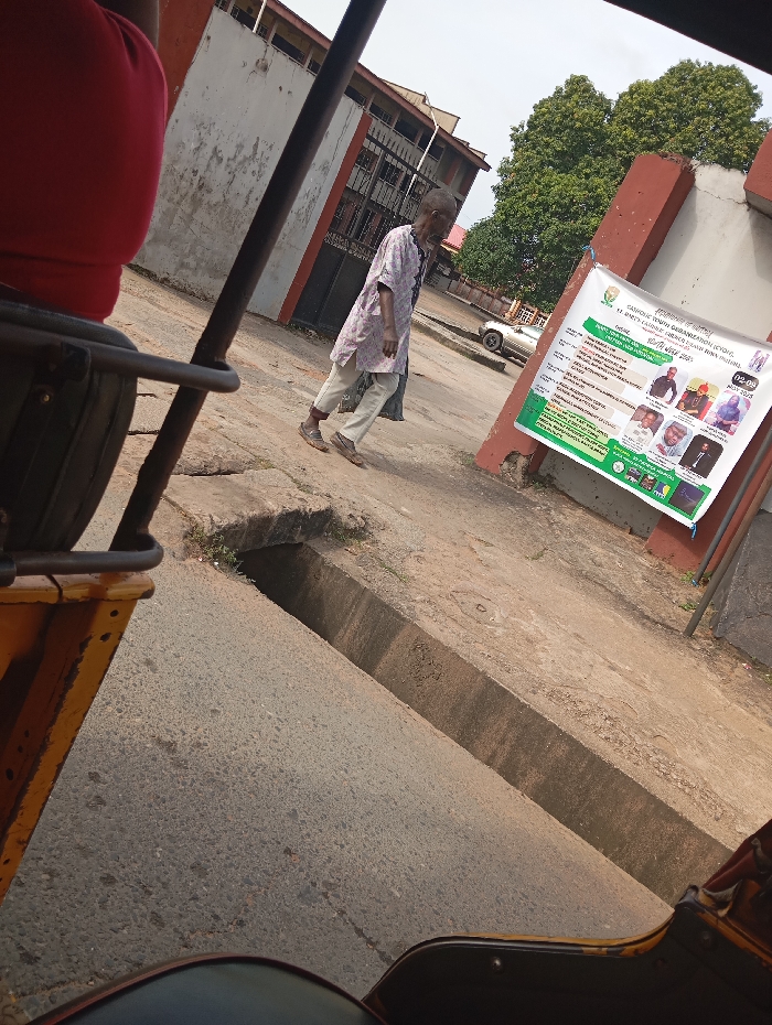 A man walks on a paved street near a building with bars on the windows. A poster is displayed on a pillar, showing images of people and text. A drainage ditch runs along the edge of the pavement. The view is partially obstructed by the frame of a three-wheeled vehicle, with a person in a red shirt visible to the left. The scene takes place in daylight.