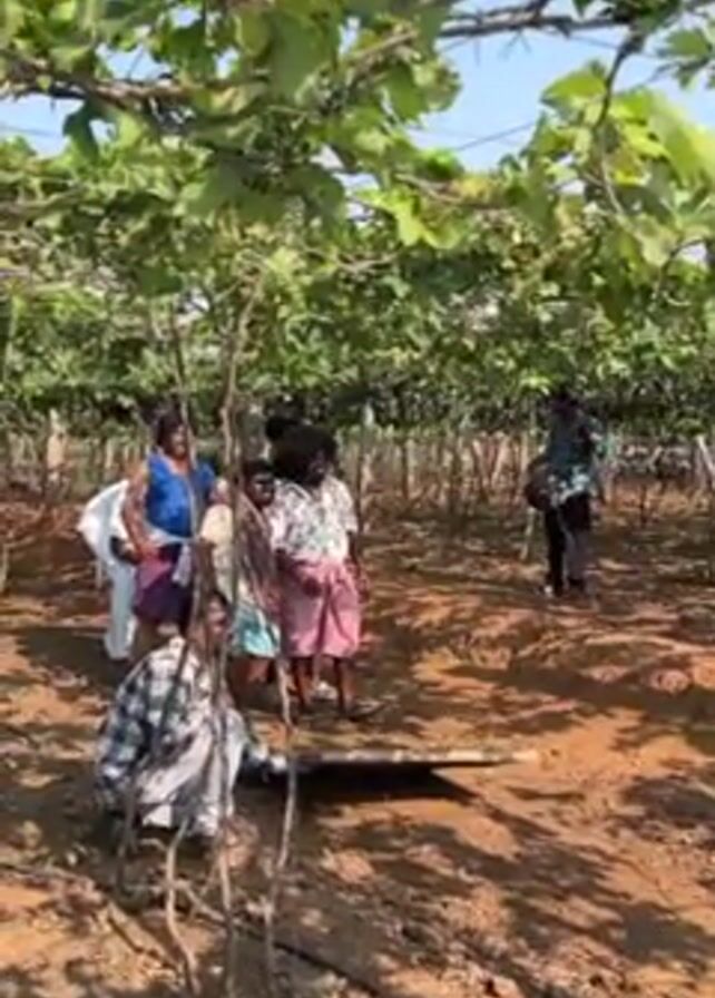 group of people gathered in what appears to be a vineyard on a sunny day. Some of the people are wearing what looks like costumes. They are standing on brown soil under rows of grapevines. A person in a plaid shirt is kneeling near the ground. Another person is walking away from the group in the background. The camera is positioned low, looking up through the leaves of the grapevines.