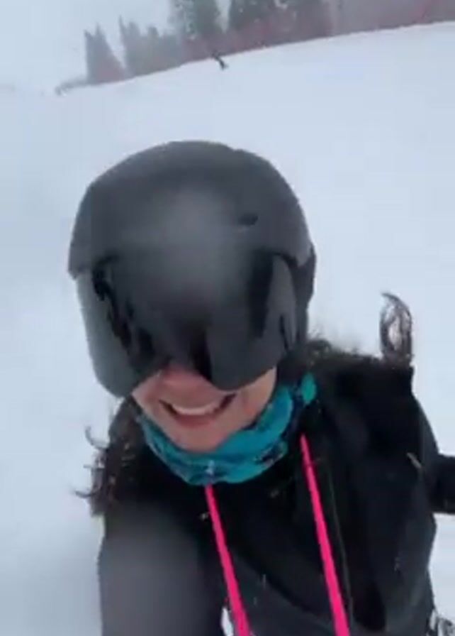 A woman skis downhill. She wears a black ski helmet with dark goggles, a black ski jacket with pink straps, and a blue neck warmer. She has dark hair braided down her back. She smiles at the camera. Her pants are patterned white and black. Her skis are gray and white. The environment is snowy, with trees and mountains visible in the distance. Other skiers can be seen on the slope. The weather is overcast and it is snowing lightly.
