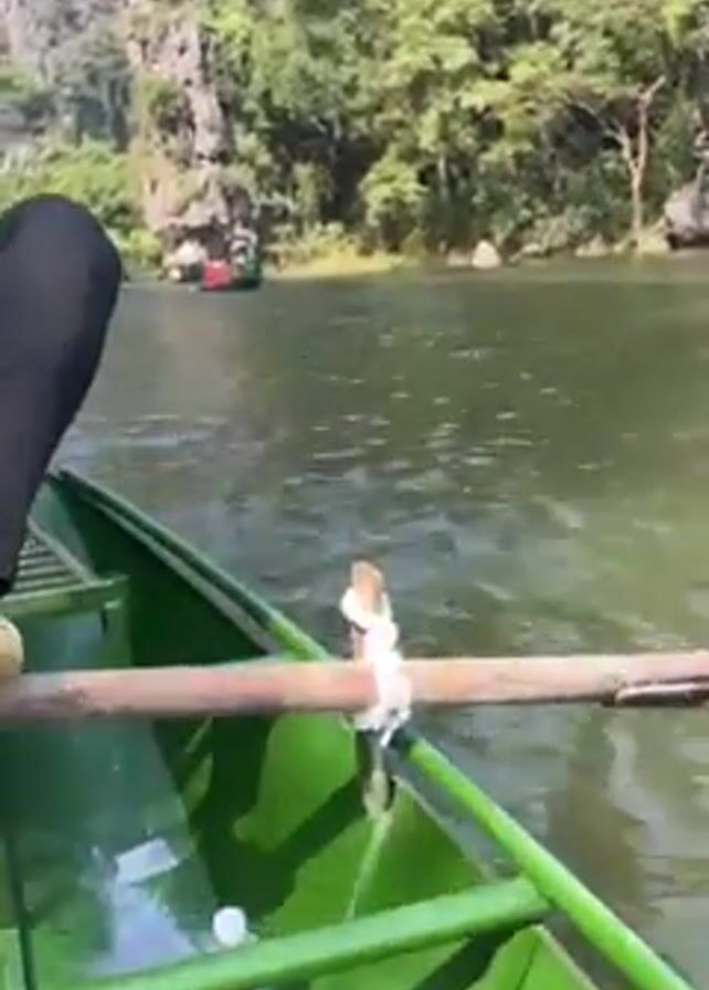 someone in a green boat rowing on a river. The person is wearing black pants and beige sandals. Their foot rests on the rowing device, which appears to be a wooden pole. The river is surrounded by lush greenery and rock formations. The water is a murky green color. In the distance, there are other boats on the river. The footage is shot from the rower's perspective.