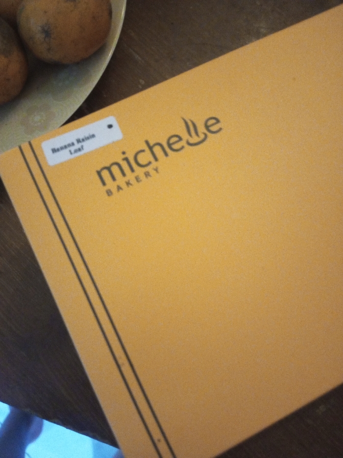 An orange bakery box sits on a wooden surface. The box, labeled "Michelle Bakery," has a white sticker in the upper left corner reading "Banana Raisin Loaf." Two thin, dark lines run down the left side of the box. A partially visible plate with two oranges rests in the upper left corner of the image. A blue object is faintly visible in the bottom left corner.