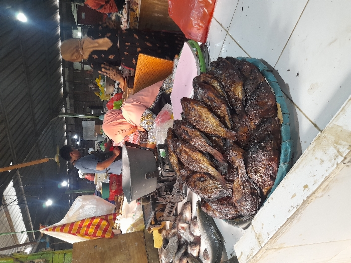 A marketplace scene shows various vendors and their goods. In the foreground, a large platter of cooked fish sits near the edge of a counter. Fresh fish are visible below. A vendor in a pink hijab is busy tending to customers. A woman in a dark floral dress stands nearby. In the background, other vendors and customers are seen under the market's roof. A weighing scale is visible near the center of the frame. A bag with red and yellow stripes adds a splash of color.