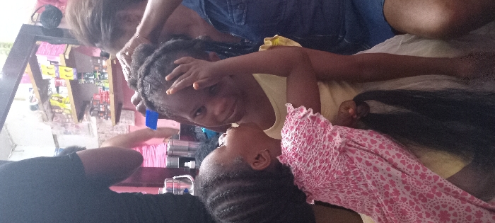 A child in a pink patterned top faces upwards toward a young woman in a yellow shirt, who smiles and touches her head. A person in a blue top is partially visible behind the woman. Another person in a black top is at the lower left. A mirror and beauty products are visible in the background. A long, dark braid of hair is draped across the woman's lap.