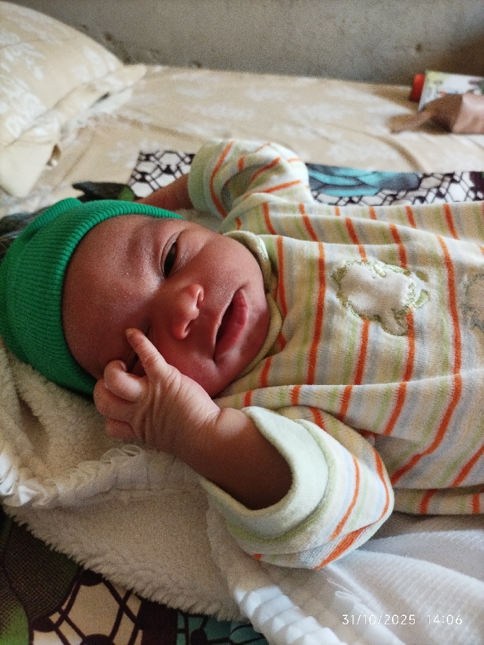 A newborn infant lies supine, centered in the frame, on a white textured blanket. The infant has dark skin, wears a solid green beanie, and a full-body sleeper featuring alternating horizontal stripes of white, light green, and orange. An embroidered light-colored, amorphous shape, resembling a cloud or sheep, is present on the sleeper's chest. The infant's right hand is raised, with the index finger positioned near its right eye. Its mouth is slightly agape, and both eyes are open, directed towards the viewer. The white blanket rests upon a patterned fabric displaying dark, white, and teal geometric designs, which in turn covers a light-colored quilted surface. In the upper left background, a beige pillow with a subtle patterned design is visible. The upper right background shows blurred objects, including a brown paper bag and another rectangular item. The scene is indoors, located in the city of Pantame, Nigeria, recorded on 31/10/2025 at 14:06.