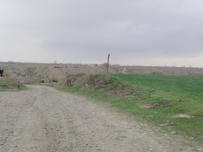 A rural dirt road stretches into the distance under an overcast sky. Fields flank the road, one side showcasing green crops, the other leading to a dry gully with scattered livestock. A lone black cow stands near the road's edge. Utility poles line the horizon. A barren tree trunk stands prominently in the middle ground.