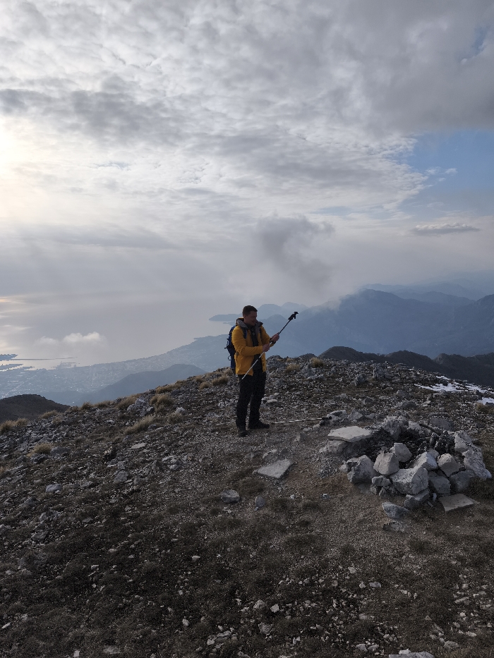 An adult male stands on a rocky mountain ridge in Mali Mikulići, Montenegro