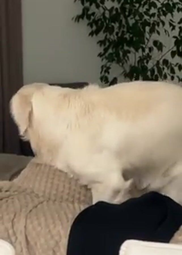 A white golden retriever dog is seen from the side, standing on top of a large bed. The bed is covered with a tan-colored quilted blanket. In front of the bed, a black garment is draped over a white chair. Behind the bed, a potted tree is visible, and a gray couch is slightly visible in the background. The dog is seen turning around and adjusting its position on the bed.