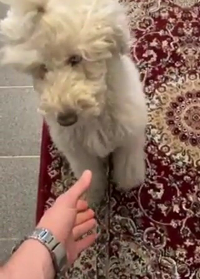 A person's hand extends towards a small, white, fluffy dog standing on a rug