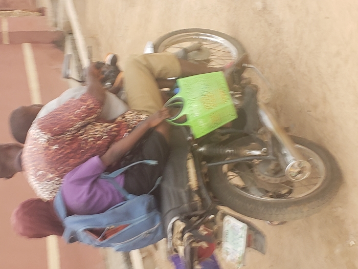 Three individuals are depicted riding a black motorcycle on a light brown, unpaved road in Zango-ndaji, Nigeria