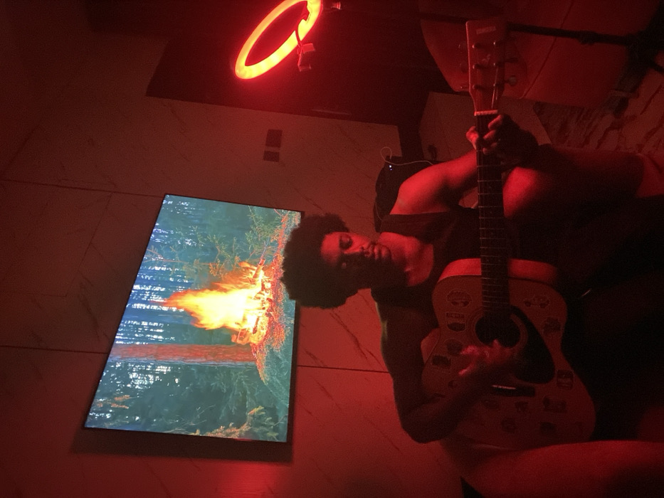 The image displays an indoor scene in Igboefon, Nigeria, bathed in red ambient light. A male individual with dark, curly hair and a dark tank top is seated, centrally positioned, actively playing an acoustic guitar. The guitar's body features multiple stickers. His left hand is on the fretboard, and his right hand is positioned near the soundhole. Behind the individual, a wall-mounted flat-screen television displays a vivid image or video of a campfire burning in a forest setting with tall trees. To the right of the frame, a circular red ring light emits illumination. The room's walls are light-colored and appear textured.
