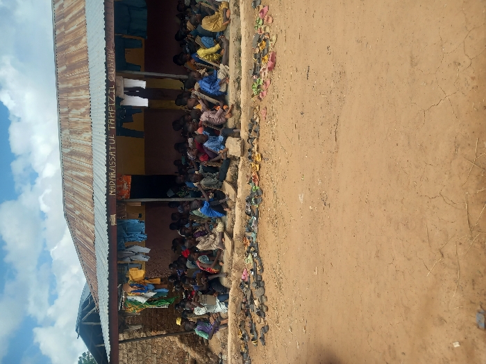 This image depicts an outdoor scene in Zabi, Nigeria, featuring a group of children gathered in front of a rustic building. The foreground consists of dry, cracked, reddish-brown dirt, indicative of an unpaved ground surface or road. Numerous pairs of assorted footwear, including sandals and slippers of various colors and sizes, are scattered in an irregular line on this dirt, directly in front of the building. The midground is dominated by a single-story structure with a weathered, corrugated metal roof that shows signs of rust. The building's walls appear to be constructed from mud bricks or a similar earthy material, particularly visible on the left side. Beneath the roof, the structure is open-fronted, revealing an interior space or a covered porch. A sign above this opening reads "MADRASSATUL TAHFIZIL QURAN" in white lettering on a dark background. Various items of clothing are hung to dry from lines or poles beneath the roof overhang. Approximately fifty children, predominantly boys, are seated in multiple rows on a raised ledge or step along the front of the building. Their ages appear to range from young primary school to early adolescence. They are dressed in casual, modest attire, including long-sleeved shirts and trousers or traditional robes, in a variety of colors such as blue, yellow, and muted tones. The children face generally forward, some appearing to be attentive, while others may be looking towards the camera. Their collective posture suggests a group engaged in a learning or listening activity. The background shows a partially cloudy blue sky overhead. To the far left, distant green vegetation is visible, suggesting a semi-rural setting.
