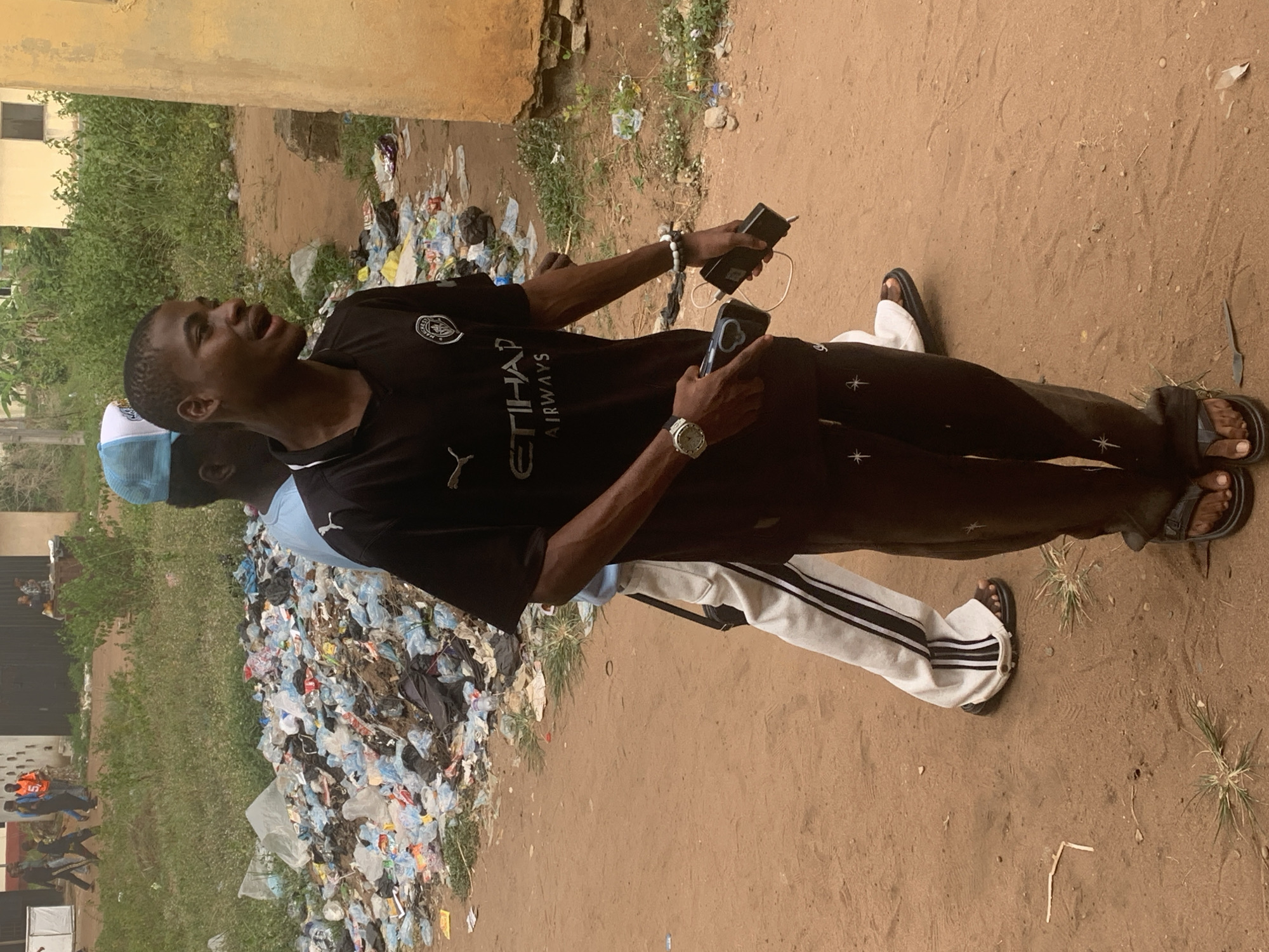 An outdoor scene in Ihiagwa, Nigeria, depicts two males in the foreground on an unpaved, reddish-brown dirt path. The primary subject, a young male with short dark hair, stands center-frame, slightly angled to the right. He wears a black short-sleeved t-shirt with "ETIHAD AIRWAYS" and a Manchester City crest, black trousers with white star patterns, and black flip-flops. On his left wrist is a silver-colored watch, and on his right wrist are two beaded bracelets. He holds two black smartphones, one with a visible silver camera lens, in his left hand, appearing to be speaking with his mouth slightly open. Behind him, partially obscured, is a second male wearing a light blue t-shirt, a light blue and white baseball cap worn backward, white track pants with black stripes, and dark flip-flops. He carries a black shoulder bag and appears to be in motion. To the left of the subjects, a substantial pile of accumulated refuse, primarily consisting of plastic bottles and various plastic bags (many light blue), is visible against a backdrop of green vegetation. In the midground, beyond the refuse and vegetation, several structures are discernible: a dark-colored building, a lighter-colored building with a small dark window, and a yellowish-ochre building wall to the immediate right of the primary subject. In the far background, indistinct figures are visible walking on another path. The ground is sparsely covered with small patches of green grass.