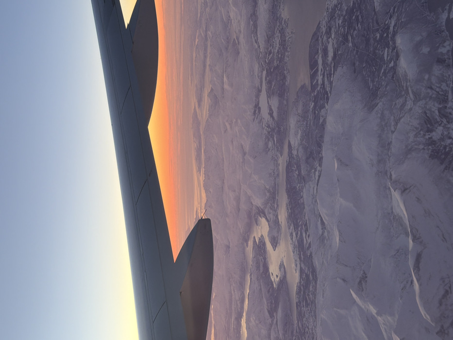 From an aerial perspective, an airplane's wing dominates the left side, contrasting with the sky's soft blue and golden hues of sunrise. The landscape below reveals a snow-covered mountain range, carved by valleys and shadowed by the morning light. This vista suggests a high-altitude flight over a serene, wintry terrain.