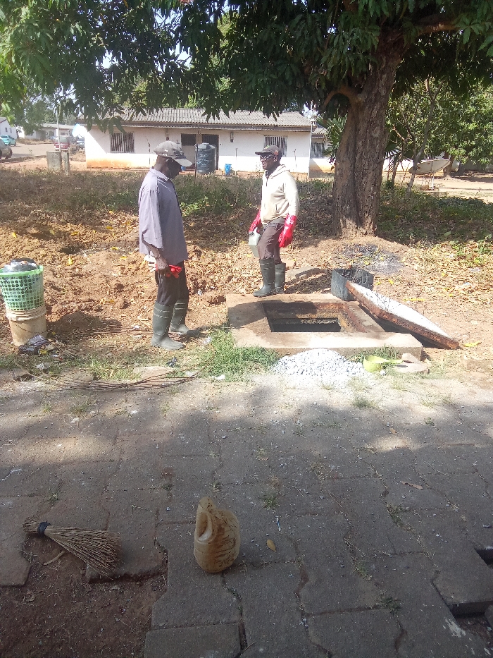 This image captures an outdoor scene in Bar Jirgi Summa, Nigeria, featuring two adult males near an open concrete structure, indicative of maintenance or construction work