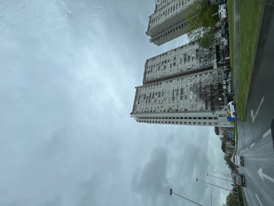 The scene captures an exterior urban environment on an overcast and wet day in the City of Zagreb, Croatia, viewed from a vehicle. The prominent structures are the Richter Skyscrapers (Rakete) in the Siget neighborhood of Novi Zagreb, specifically observed from Avenija Većeslava Holjevca. Three multi-story concrete residential buildings, characterized by their numerous balconies and visible signs of age, stand vertically in the midground and background; two are centrally positioned and taller, with a third similar but shorter building further right. The ground consists of a multi-lane asphalt road, marked with white directional arrows and lane lines, and is visibly wet from recent rain. A grassy median separates the road from the structures. Several vehicles, including white and dark-colored cars, are present on the road, some appearing to be in motion, others parked. Tall streetlights with overhead electrical lines line the left side of the thoroughfare. The sky is entirely covered by a thick, uniform layer of grey clouds. No discernible human figures or specific actions are visible.