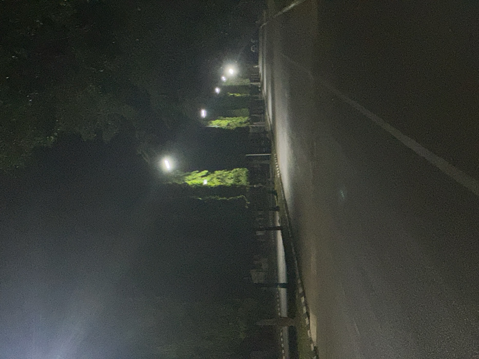 An angled view of a dark road at night. Streetlights line the left side, illuminating green foliage. The road surface appears wet, with a white dividing line on the right. The scene is dimly lit, creating a somewhat eerie atmosphere.