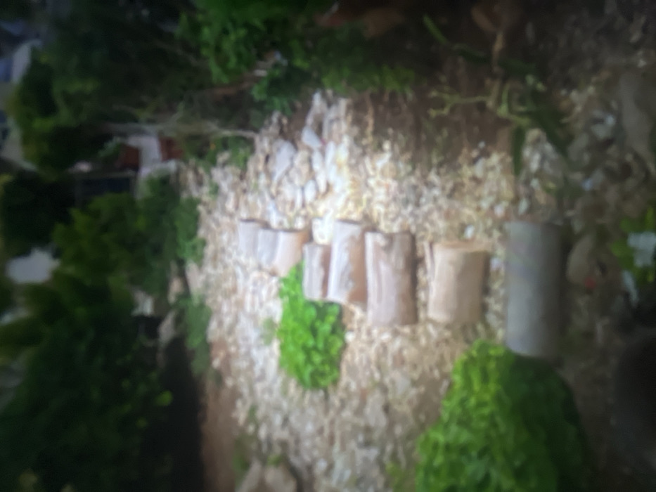 An overhead shot reveals a garden arrangement. Cylindrical wood pieces, resembling small stumps, are linearly spaced on a bed of light-colored gravel. Patches of green foliage emerge between and around the wood. Lush greenery, darker in tone, fills the edges of the frame, creating a natural border. Overall, it's a miniature, landscaped scene.