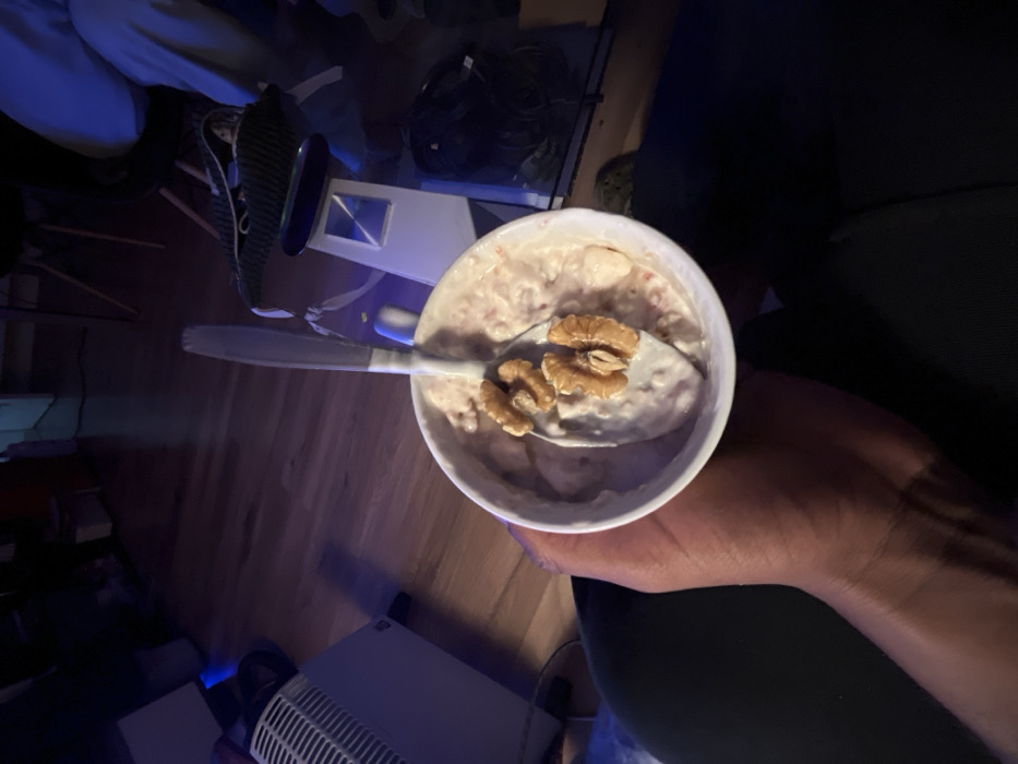 The image presents a first-person perspective, looking down at a person's right hand holding a white ceramic mug. The mug contains a light-colored, creamy substance, possibly porridge or yogurt, with two whole walnut halves visible on the surface. A silver-colored spoon is inserted into the mixture. The visible forearm and hand of the individual display a dark skin tone. The background is an interior residential space, dimly lit with a pronounced blue ambient light. Visible objects include a white electric radiator or heater positioned on the left side, light-colored wooden floorboards, and a white, floor-standing appliance, possibly a humidifier or air purifier, on the right. Part of a second individual's leg, clad in light-toned trousers, is visible in the background, seated. Additional indistinct dark objects suggesting furniture and coiled cables are present in the further background. There are no discernible visual cues within the image to indicate the specific city of Barcelona, Spain.