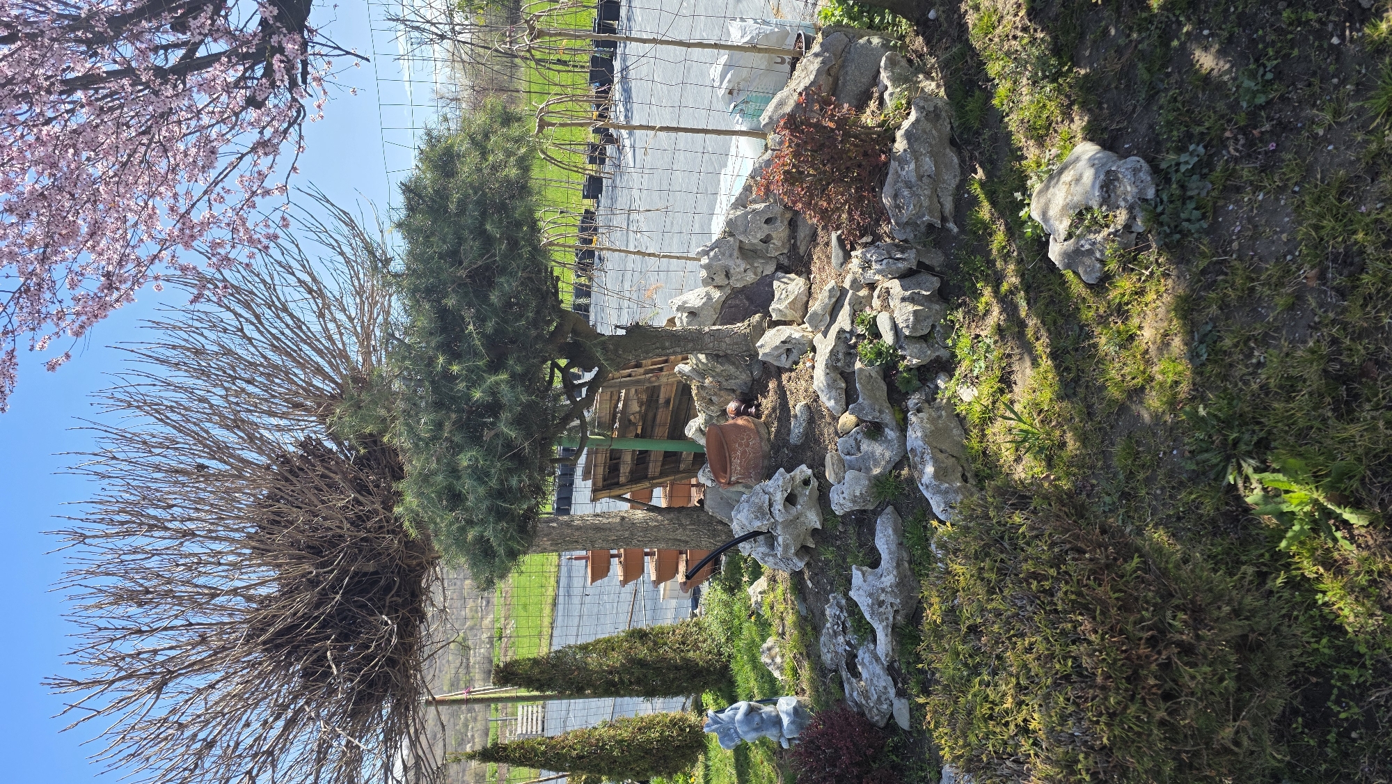 garden scene in Usoika, Bulgaria. A leafless tree with bare branches stands beside a green coniferous tree. Behind them is a fenced area with black pots and a white plastic sheet covering the ground. A rock garden is arranged with various sized stones, some with holes, and small plants. A terracotta pot lies on the ground. Other garden plants and bushes are visible, along with patches of grass. The sky is blue and a flowering tree with pink blossoms is partially visible at the top left of the frame.